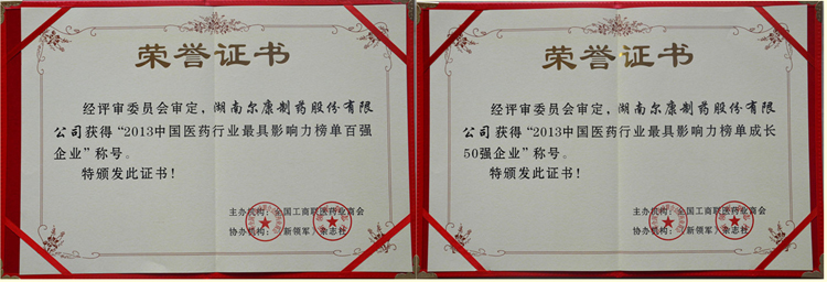 爾康制藥榮獲2013年度中國醫藥行業最具影響力榜單“百強企業”、“成長50強”殊榮