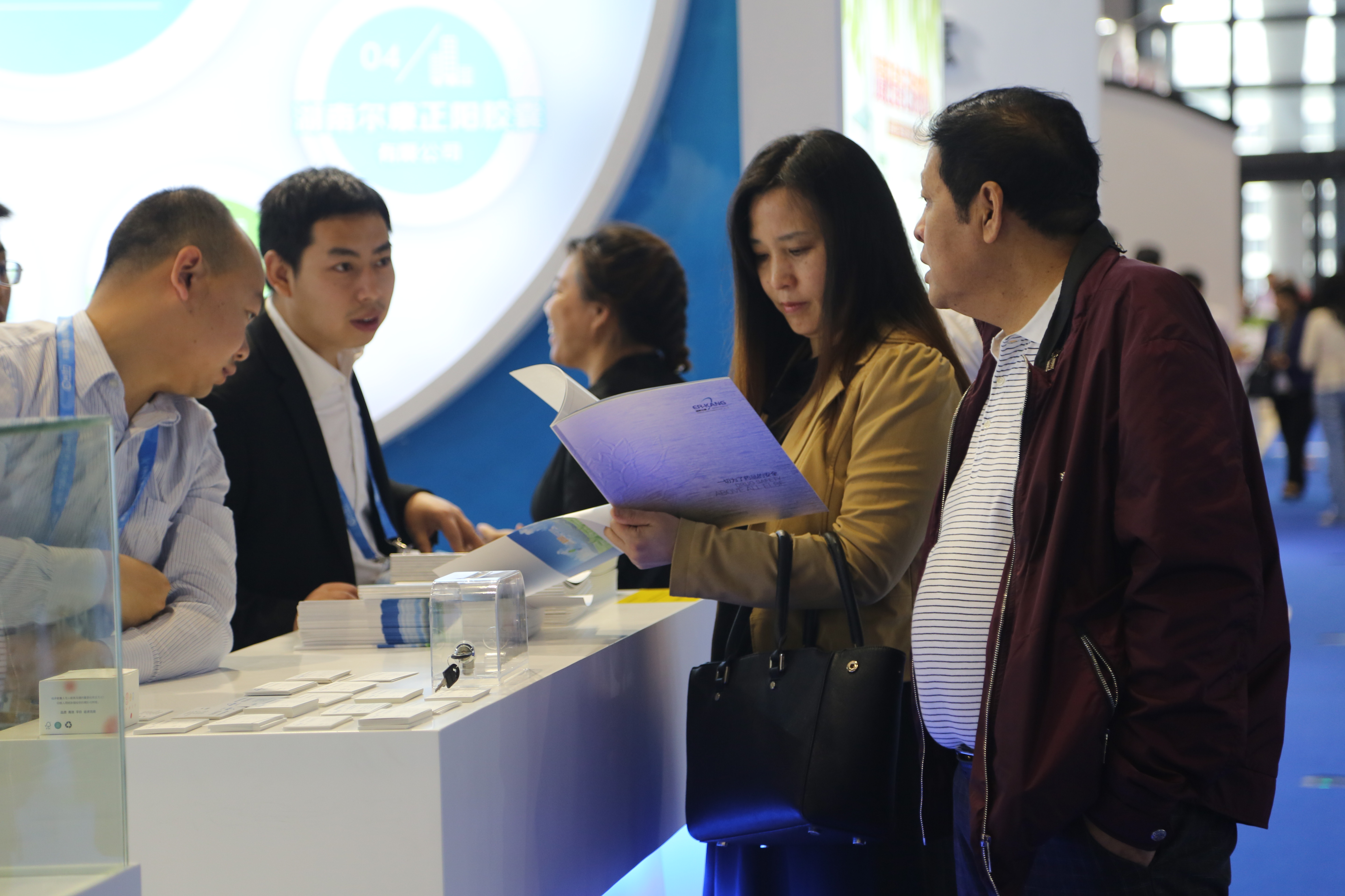 一進入上海國家會展中心大門,爾康制藥藍白簡約風格的展廳就映入眼簾,百余平方米的展廳內整齊擺放著近三十套桌椅,展臺上井然有序的陳列著參展產品,四十余名工作人員精神煥發,用心接待每一位客戶,努力讓每一位客戶滿意。