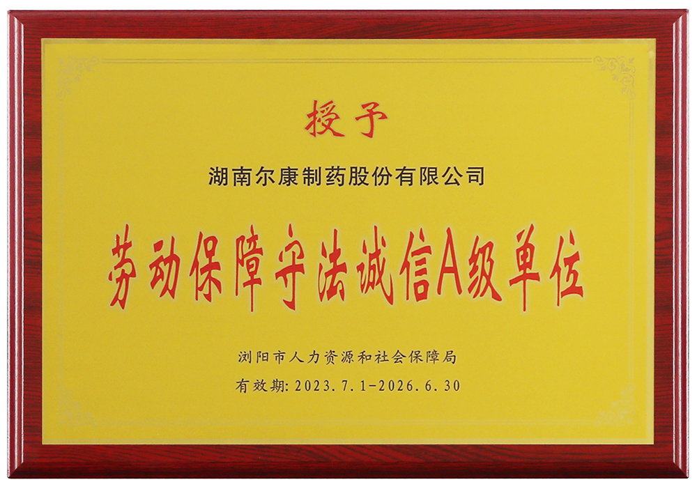 爾康制藥榮獲“勞動保障守法誠信A級單位”