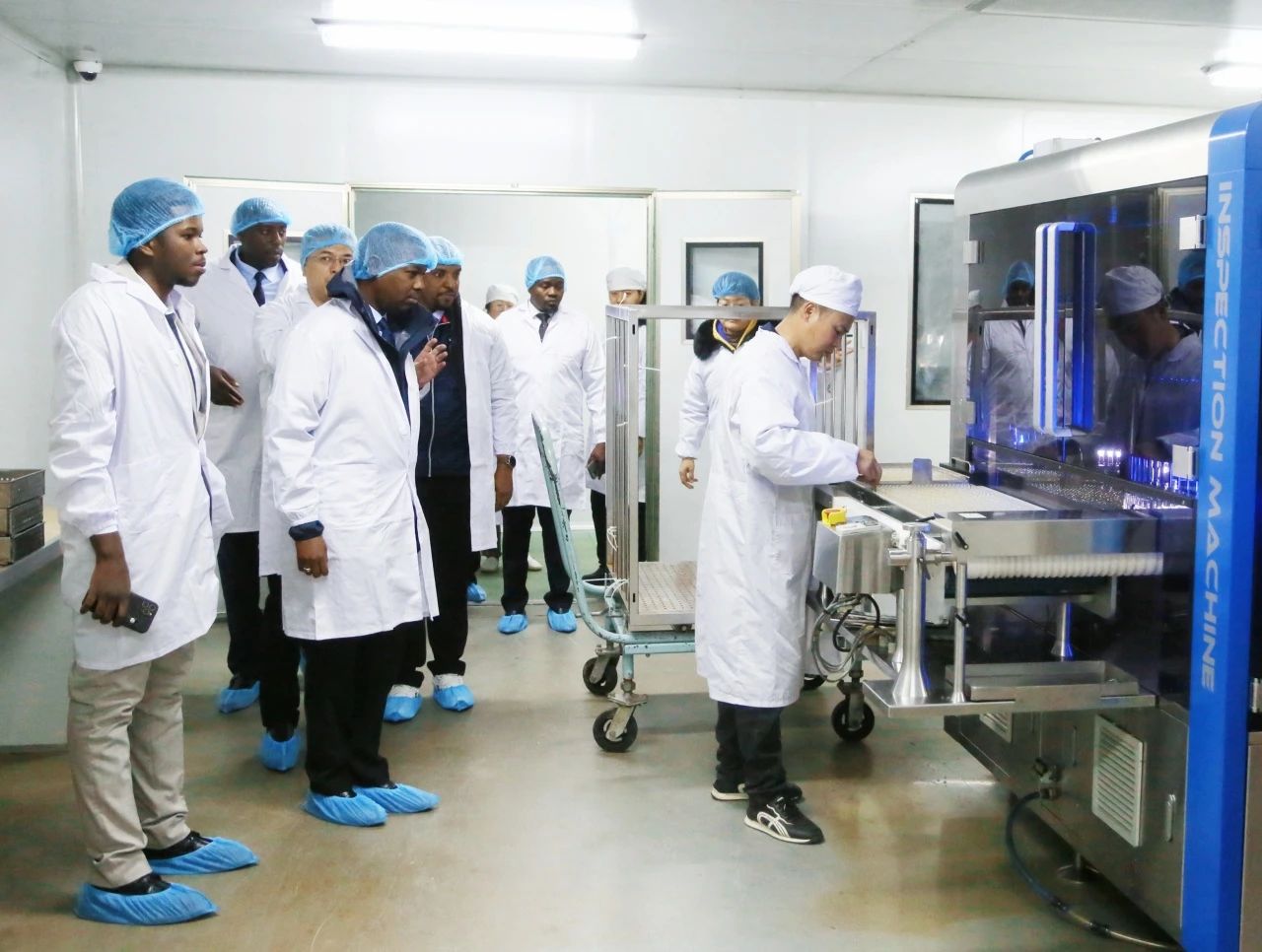 在爾康制藥董事長帥放文的陪同下,坦桑尼亞官員一行參觀了公司的成品藥制劑車間。現代化生產設備和自動化生產流程給他們留下了深刻印象,他們對爾康制藥在藥品生產、質量控制以及包裝流程等方面的嚴格標準和先進技術表示高度贊賞。