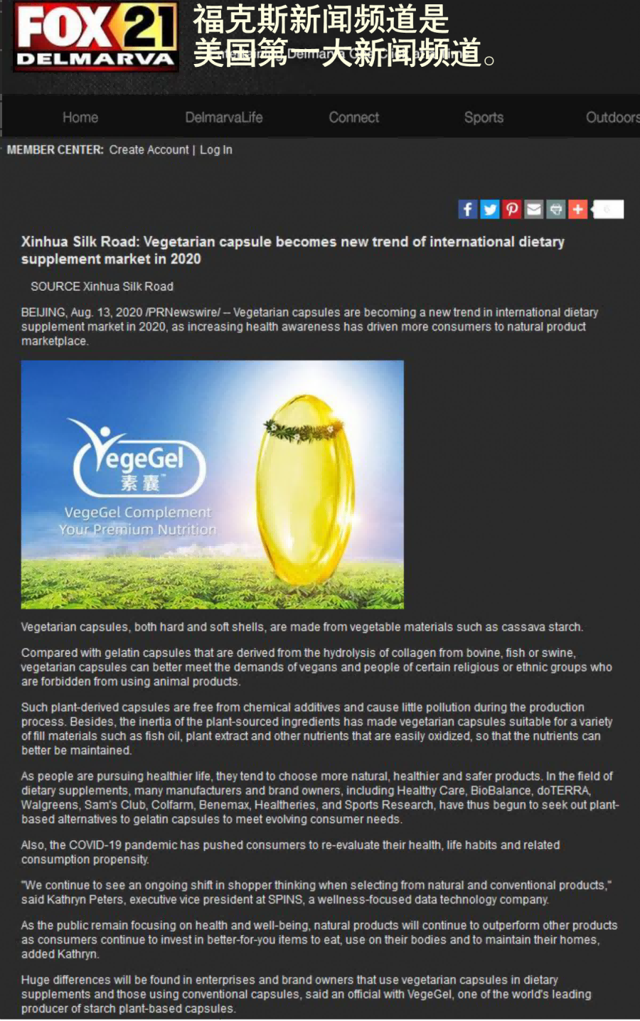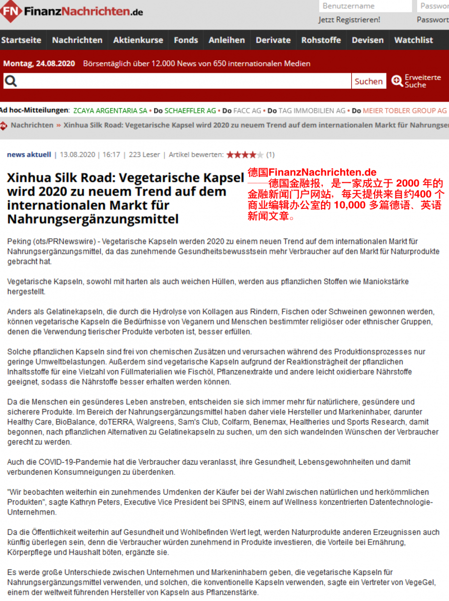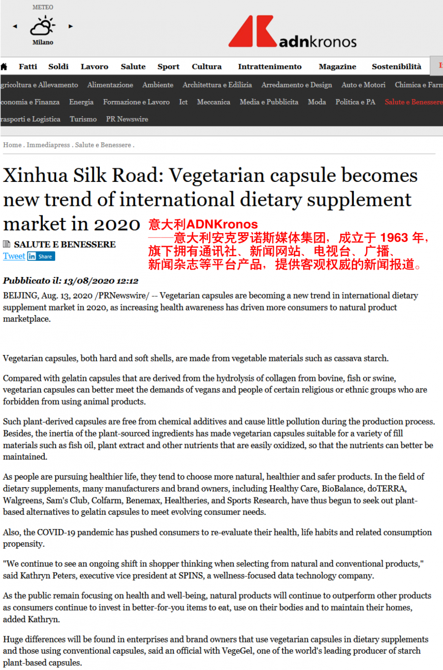 日前,植物膠囊在國際上再度引起關注,一篇題為《Vegetarian capsule becomes new trend of international dietary supplement market in 2020》探討淀粉植物膠囊或成2020年膳食補充劑新趨勢的文章,被北美Fox、Yahoo! Finance、Business Insider: Markets Insider 、Seeking Alpha、Canadian Business Journal,歐洲Xpert、Notre Siècle、FinanzNachrichten.de、ADNKronos 、Europa Press 、PAP等超40余國家、全球近900家國際媒體轉載發布。